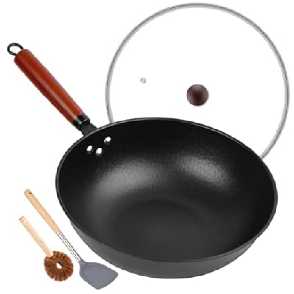 [Perfect Size & Multi-Purpose] Perfect Size: 13″W and 3.5″D. This extra large size wok pan with lid can serve at least 3-5 people of food portions, perfect for family use and gatherings with friends.